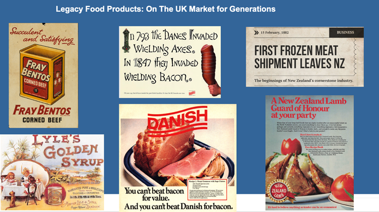 - milk and mutton & lamb – these were shared production duties with New Zealand, whereas beef in early years was principally British and supplemented by Argentina and Uruguay (remember cans of corned beef? Fray Bentos is a city in Uruguay!). Latterly, Irish beef has been commonplace in our market. What’s surprising is that the UK, uncommonly good at growing grass, didn’t emerge as a significant milk product and red meat exporter;