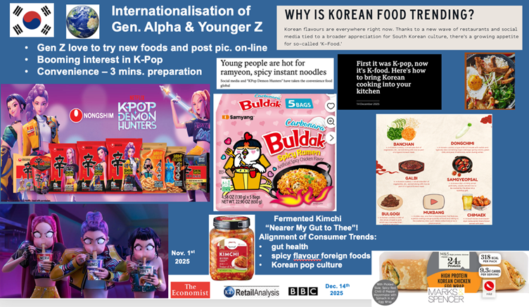 Convenience has become paramount, especially for Gen Z, where “convenient” means immediate. As processors increasingly sit between farmer and consumer, provenance often fades from view unless the product is positioned as special or premium. International cuisine trends, amplified by social media, continue to shape demand. Korean food, Japanese‑inspired snacks and viral trends illustrate how quickly tastes can change. These forces are global and unlikely to reverse.