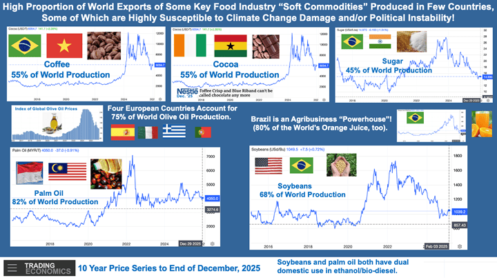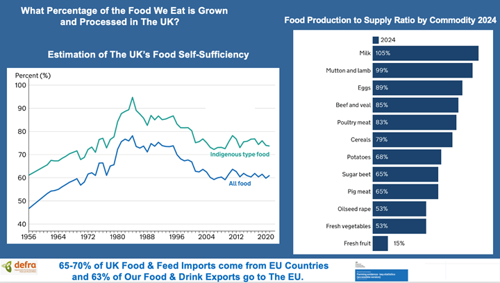 A high proportion of world exports of key food industry “soft commodities” are produced in few countries: e.g. coffee, cocoa, sugar, palm oil, olive oil, orange juice. If they have production problems, we have grocery procurement problems! At home and in history, UK food production was a shared job between our farmers and those offshore, largely from “The British Commonwealth”. UK food self-sufficiency was below 50% pre-WW2, rising to 75+% in our earlier EU years in the 1980’s, then, drifted down to settle around 60% in the 2000’s. In her Farming Profitability Review (December 2025), Minette Batters sees one of the routes to improve profitability of British farming and to increase our food self-sufficiency is through growing the British food & drink brand at home and abroad by “growing, making, producing and selling more from our farms….”. Food production expansion may be a key element in our national farming and food strategy but begs the question why are we only 60% self-sufficient in food now? Each of the principal commodity areas have their own explanatory tales: