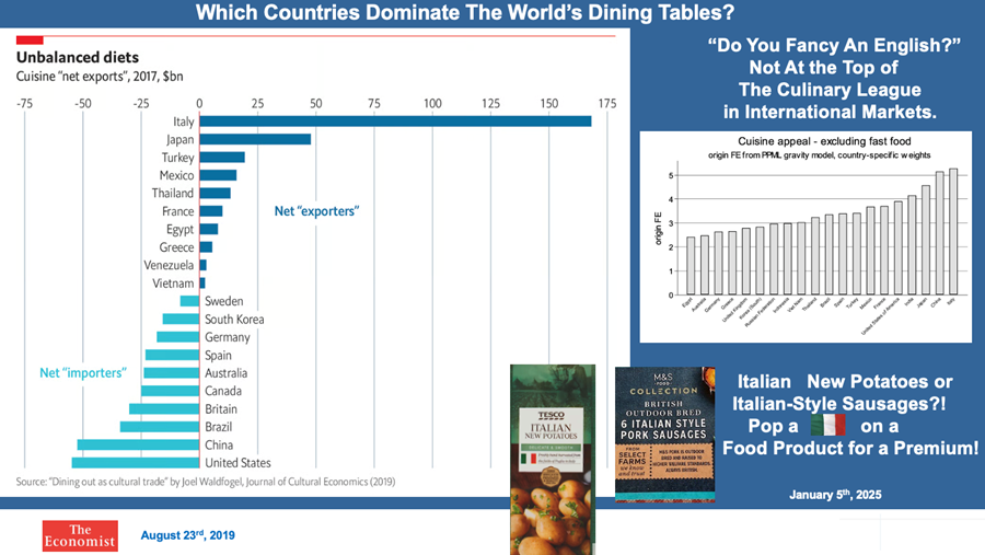 Returning to the mission “to grow the British brand for food & drink”, let’s start in our best market, i.e. The UK. Our consumers have a positive impression of British agriculture and accord farmers with a high level of trust. Interest in farming and food production is increasing, particularly amongst younger consumers (a Clarkson affect?). However, whilst they’re positive about British food, they also like imported foods. Why shouldn’t they as it’s been in our market for centuries. Preference for “my own country’s food” is highest in Italy – arguably, the country with the strongest food culture in The World. Italian cuisine, too, has pride of place on the dining tables of countries across the world, ahead of Chinese, Japanese and Indian meals. Tourists traversing the globe are unlikely to ask “anybody fancy an English?” when deciding what meal to eat of an evening! In UK supermarkets, food retail and food service is converging – shoppers are more likely to buy a meal than a collection of ingredients – and the meal can be selected from a panoply of international cuisines. The retail ready meals market, at £5.3bn. in 2025, was substantially larger than the combined retail sale of chilled beef, pork and lamb cuts. On ready meals, the UK is no global outlier. Buying the cooked meal from a market is common in Asia (e.g. Thailand) but there the meal is very likely to be traditional, local fare. Within our own market, a mention of Italy or France in relation to food, often as not, is associated with a premium priced product.
