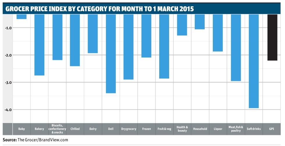 This month in the UK, the inflation rate dropped to 0%, a level not seen for 50 years and, what’s more, we could see negative figures (deflation) in the upcoming months. The principal drivers are declines in both fuel and grocery prices: in February, every major grocery category experienced month on month value falls (see chart) – a month in which, historically, price increases are expected particularly for fresh produce. Surely, this is good news for consumers but has dire consequences for the major supermarket retailers who are caught by a double whammy blow – lower prices on lower volumes of groceries with excruciating negative impact on their net margins; and continuing relentless erosion of their market shares by the hard discounters with Aldi and Lidl currently holding about 8% national grocery market share but forecasted to grow to 15% over the next very few years.