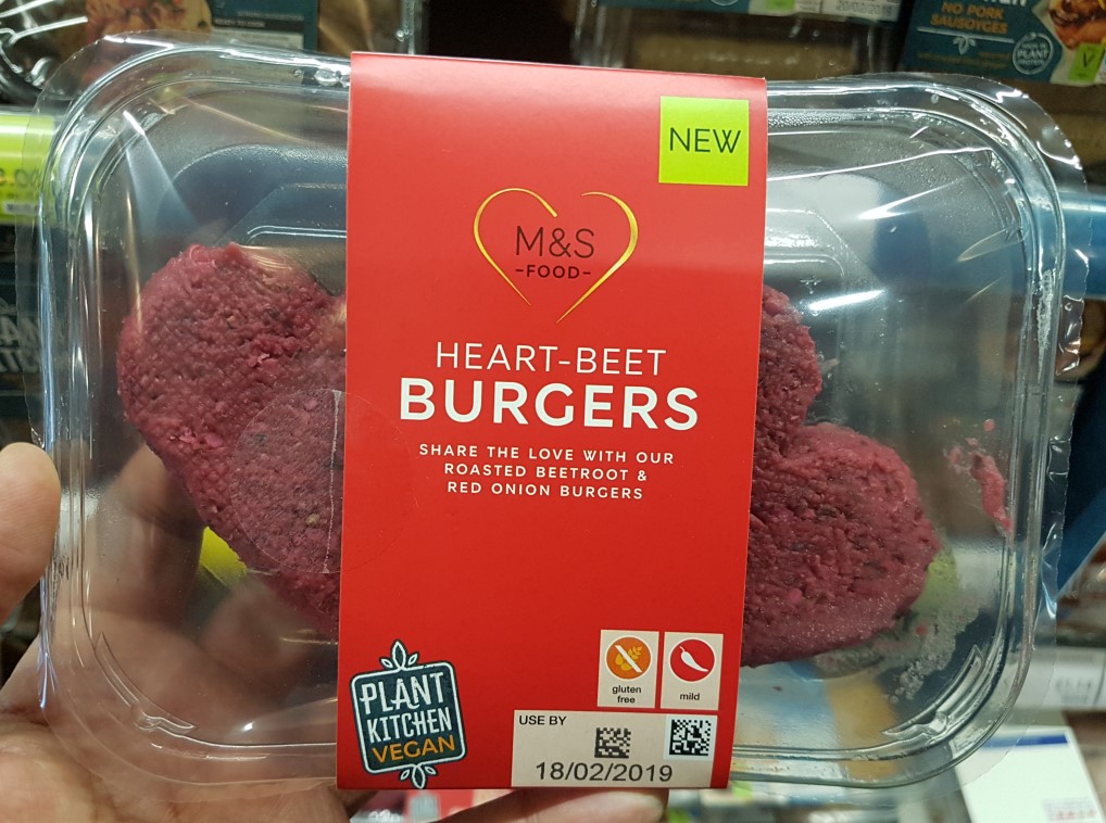 - M&S introduced its Plant Kitchen range and had a special offer Vegan Valentine’s Dinner for February 14th featuring a heart-shaped beetroot burger;