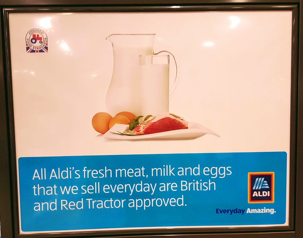 - hard discounter Lidl, with enough cheek for another row of teeth, extolling its Birchwood Farm brand for fresh meat sold in England and Strathvale Farm for Scotland – the nearest either of these farms have been to verdant pasture is the front lawn of the advertising copywriter!;