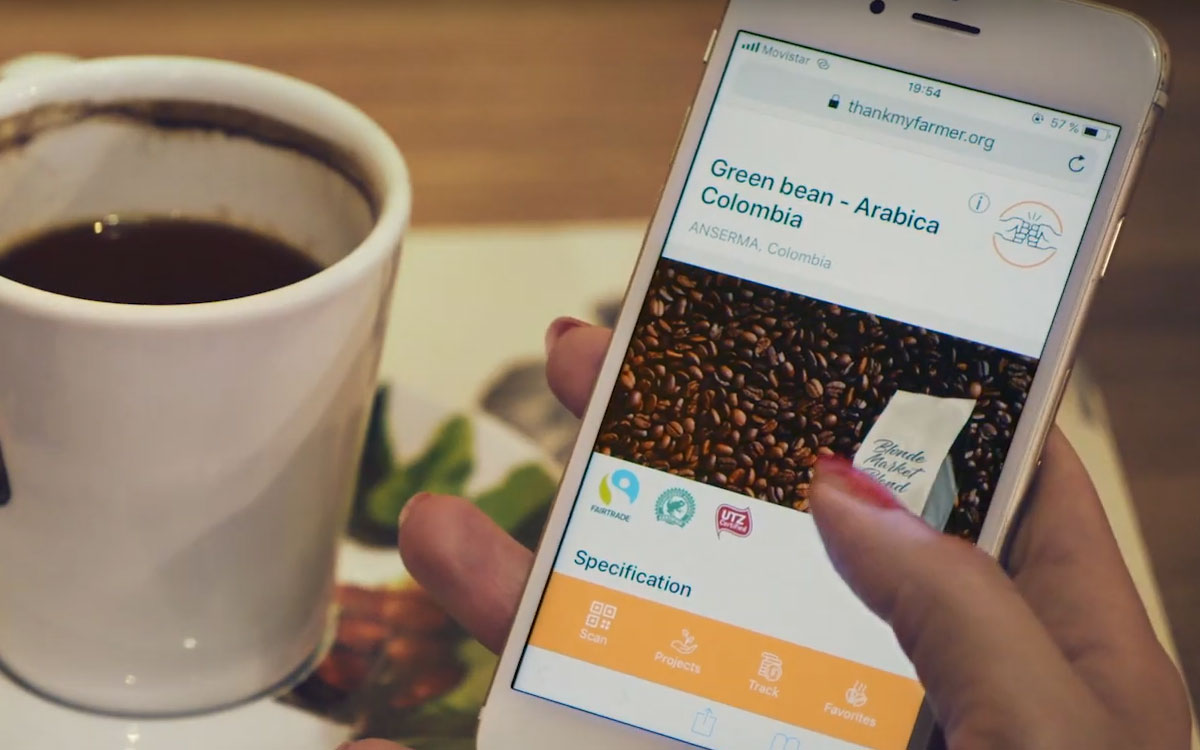 - a “Thank My Farmer” app powered by IBM Blockchain gives consumers the ability to trace their coffee beans with an interactive map. The app has been developed by, inter alia, Jacobs Douwe Egberts, J.M. Smucker, the Columbian Coffee Growers’ Federation and Rabobank;