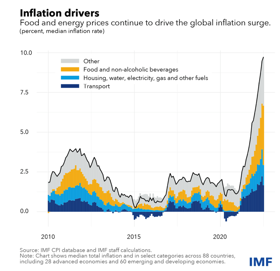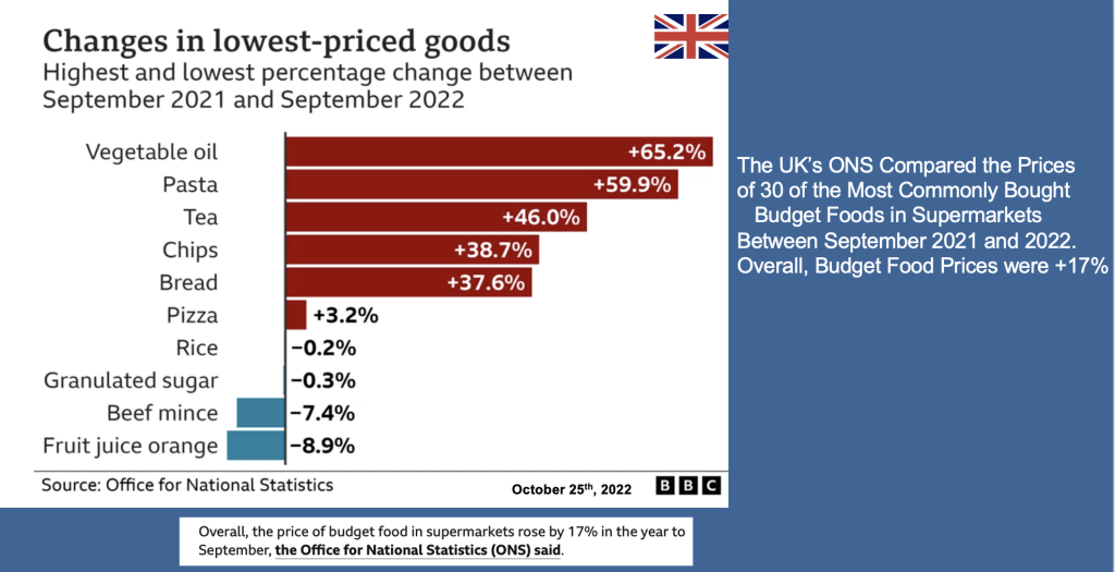 The IMF notes that food and energy prices continue to drive the global inflation surge. In the UK, consumer price inflation is at around 10%, highest as it has been for decades, with food price inflation a hefty 14%. The UK Office for National Statistics has shown that a basket of the lowest priced grocery items from supermarkets “value lines” are 17% higher now than 1 year ago. It’s the same story in many countries with particularly damaging consequences for those on low incomes (in many emerging nations – e.g. much of Africa – half the household income is spent on food and double digit food price inflation is devastating). In so-called higher income “developed” countries, household incomes in general have increased over time, but polarisation is more evident – there are comfortable “haves” and a much larger grumpy group of “have nots”. The story is the same in the UK, much of Europe, North America, or Australia.