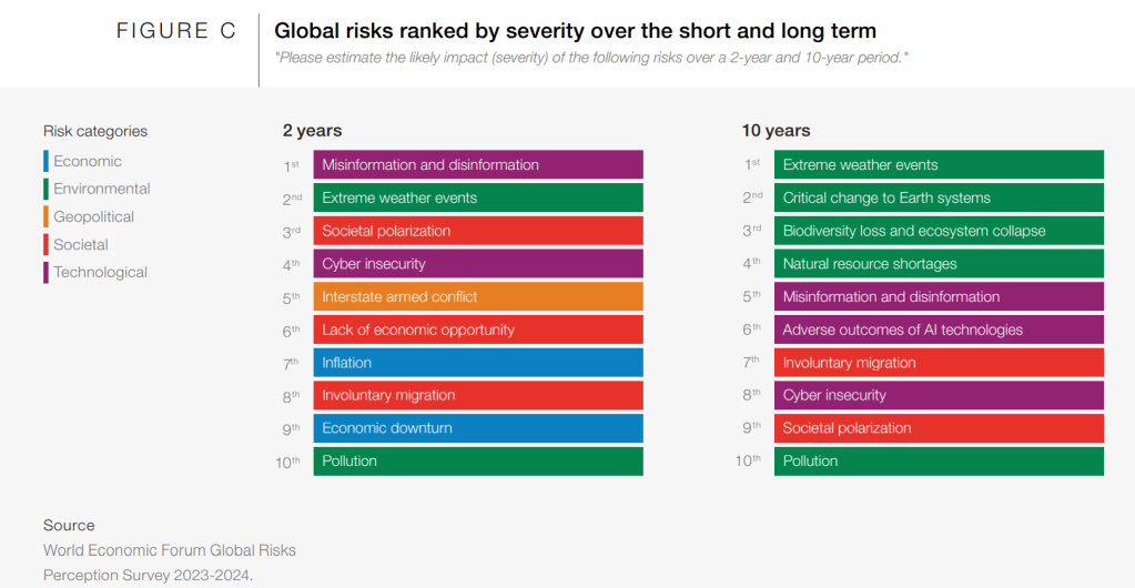 The World Economic Forum (WEF) has just released its 2024 Global Risks Report for business. They canvass the views of businesses and relevant institutions around the world to come up with their shorter- and longer-term business risk league tables. Not that we need a nudge, but it’s a salutary reminder that the past turbulent 4 years (remember, kick-started by an unknown virus popping up in Wuhan) are not now morphing into a period of peace and tranquillity. “It ain’t over till it’s over”, to quote Yogi Berra, the baseball legend and moral philosopher!