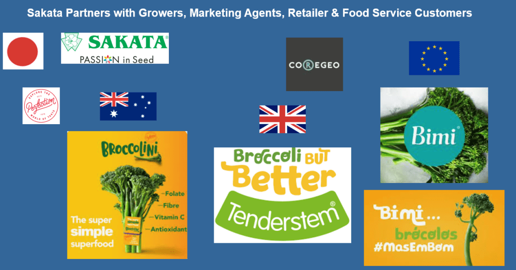 - Japanese seed company Sakata partners with marketing organisations in Europe (Bimi/Tenderstem), USA (Baby Broccoli), Australia (Broccolini) who work with local growers to produce the popular green vegetable which is a cross between Chinese Kale and broccoli and sells at a substantial price premium to commodity broccoli. Apple & Pear Industry Australia representing Australian apple and pear growers uses a similar approach to Sakata in marketing Pink Lady apples around the globe. Pink Lady are grown in Australia, New Zealand, Europe (but not yet in the UK), South America and South Africa and achieve a mouth-watering price premia in Europe and beyond;