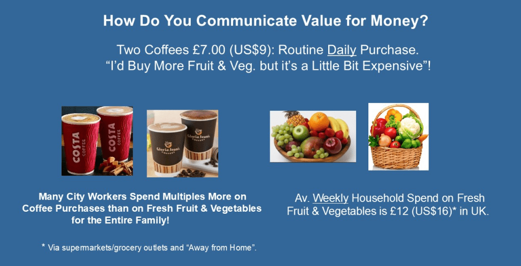 It’s a truism that fresh fruit and veg. are indispensably healthy but are perceived to be expensive. In consumer surveys across the globe, a common response is “I’d like to buy more but they’re kind of expensive”. Yet, many urban workers spend twice as much on their coffee purchases in the week than they do on fresh fruit & veg. for the entire family! Sadly, fresh produce is not addictive like coffee, nicotine and alcohol. The challenge is to present fruit & veg. in a form that meets consumer requirements and to communicate its cracking value for money and contribution to family health.