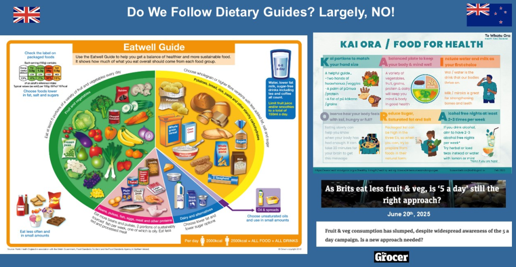 Wherever one looks. North America, Europe, Australasia, Japan, per capita fresh fruit and vegetable consumption is drifting downwards. What’s going on? Everybody knows that they’re essential for our health but very few of us get even close to meeting our 5-a-day targets. The UK Eatwell Guide and the New Zealand equivalent infographic are resplendent with fresh produce which look pretty on the kitchen wall, but they attract dust rather than attention! Fresh produce market volumes may show a slight increase, but these are driven by rising population not individual households eating more.